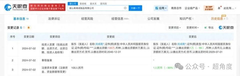 天眼查工商信息显示,该公司成立于2022年3月,法定代表人为刘成乾,原注册资本100万元人民币。值得注意的是,2024年7月,该公司注册资本骤降至1万元,降幅达99%。目前,该公司由刘成乾全资持股,经营范围涵盖纸制品制造与销售等。这一大幅减资动作,被视为企业收缩防线甚至准备退出的信号。