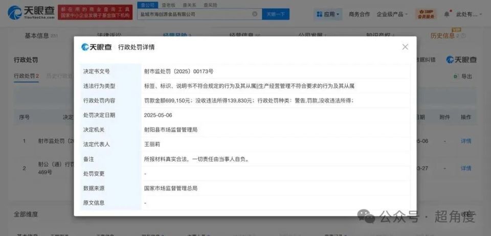 相比之下,食品领域的造假行为迎来了更直接的行政处罚。针对“保水虾仁”增重乱象,盐城市海创源食品有限公司付出了沉重代价。天眼查App显示,该公司于2025年5月因标签标识不符及管理违规,被射阳县市场监督管理局罚款约69.9万元,并没收违法所得约14万元。