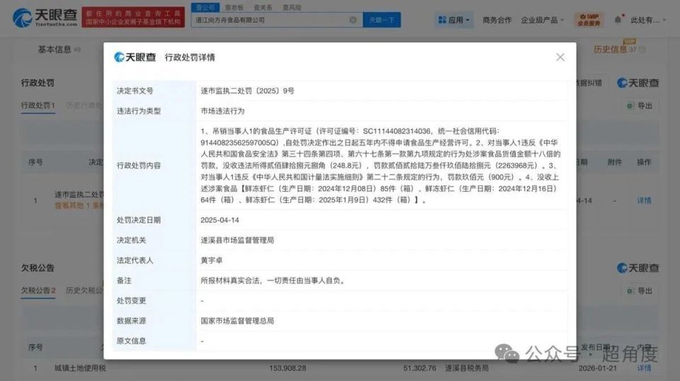 更为惨痛的是湛江尚方舟食品有限公司。天眼查显示,该公司不仅被遂溪县市场监督管理局罚款约226万元,更直接被吊销了食品生产许可证。这意味着该企业彻底失去了从事食品生产的资格,为其违规行为画上了句号。