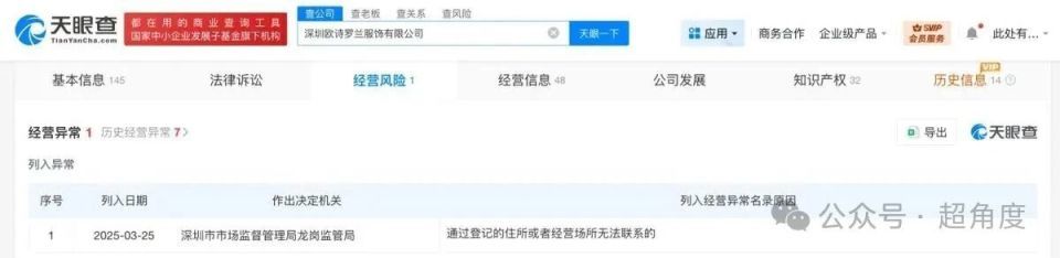 在一次性内裤领域,情况更为严峻。深圳欧诗罗兰服饰有限公司因产品未灭菌被曝光。天眼查信息显示,该公司成立于2018年10月,注册资本300万元,由李军伟、李美霞共同持股。2025年3月,该公司因“通过登记的住所或经营场所无法联系”,被列入经营异常名录。