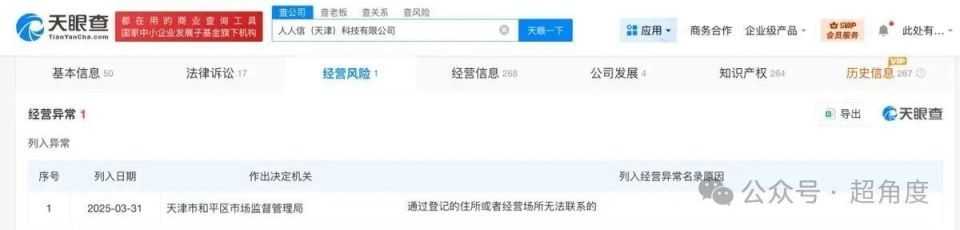天眼查App显示,人人信(天津)科技有限公司因通过登记住所无法联系,于2025年3月31日被列入经营异常名录,该公司由马俊全资持股,曾涉足软件开发及数据处理服务。