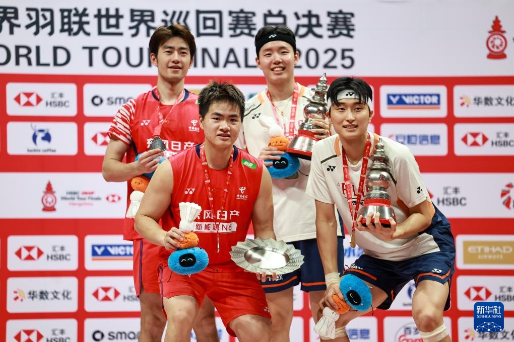 12月21日,冠军韩国组合金元昊(右下)/徐承宰(右上)和亚军中国组合梁伟铿/王昶(左上)在颁奖仪式上。新华社记者 江汉 摄