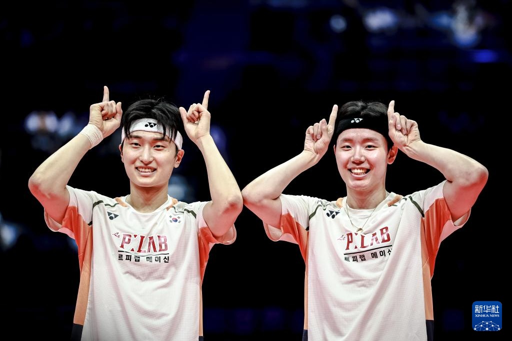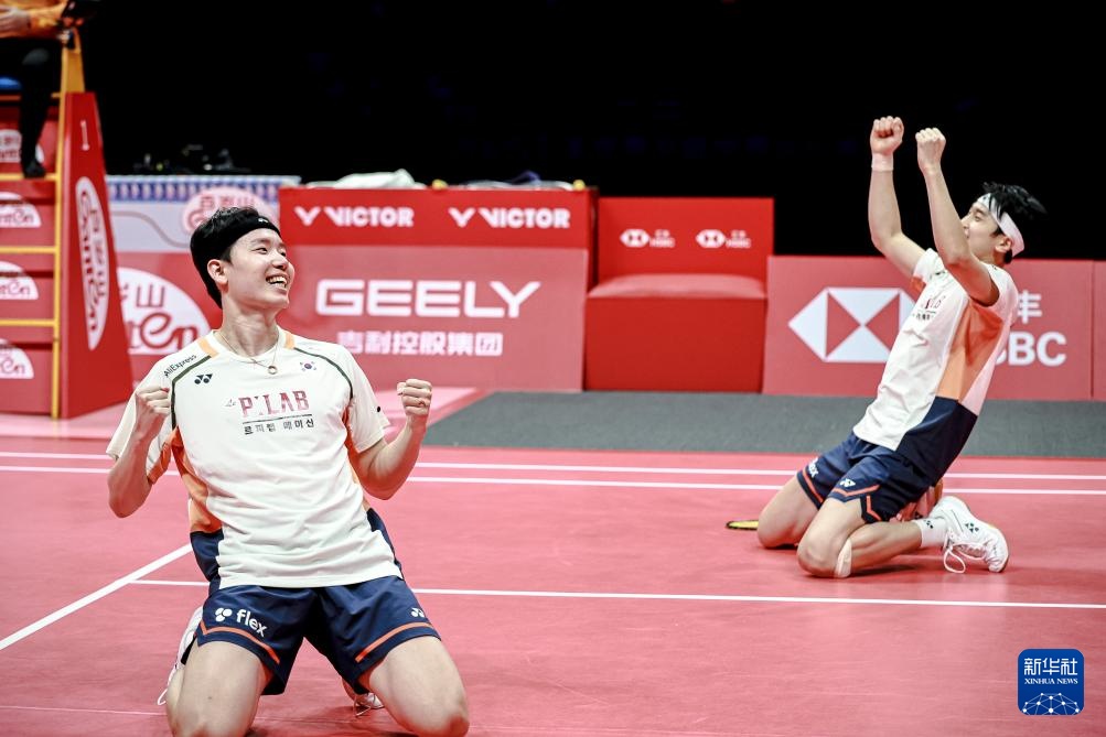 12月21日,韩国组合金元昊(右)/徐承宰在决赛后庆祝夺冠。新华社记者 江汉 摄