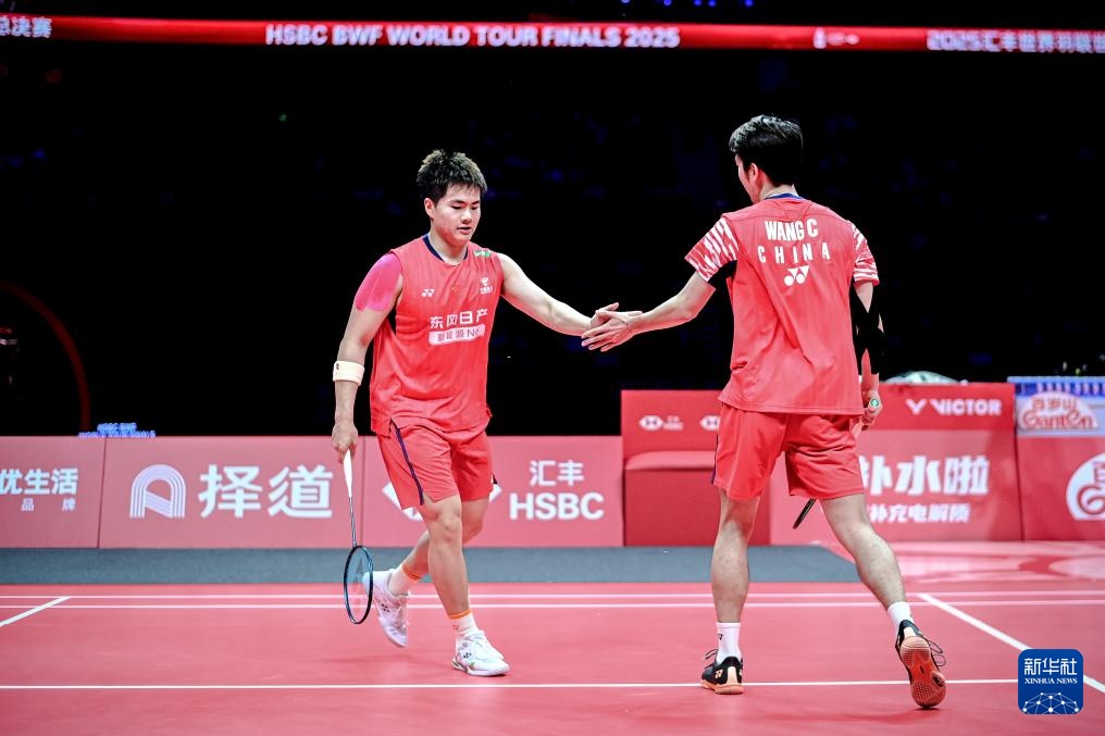 12月21日,中国组合梁伟铿(左)/王昶在决赛中庆祝得分。新华社记者 江汉 摄