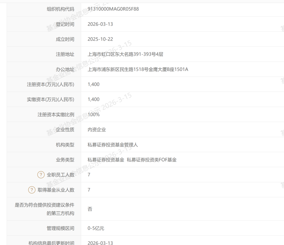 根据基金业协会,璞桥成立于2025年10月,注册资本1400万,规模0-5亿,全职员工7人,目前尚未发行基金。合规负责人,同样来自中欧。