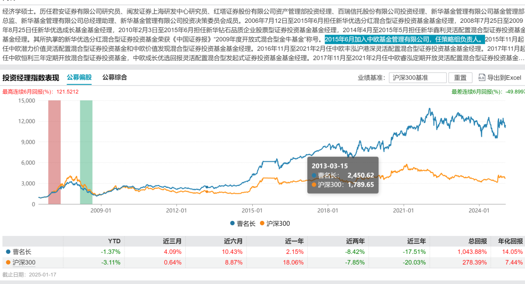 金石杂谈查询发现,曹名长,历任君安证研究员、闽发证券上海研发中心研究员、红塔证券资产管理部投资经理、百瑞信托投资经理、新华基金管理部总监、总经理助理、投资决策委员会成员,2006年管理了自己的第一只基金。2015年6月加入中欧基金,任策略组负责人。